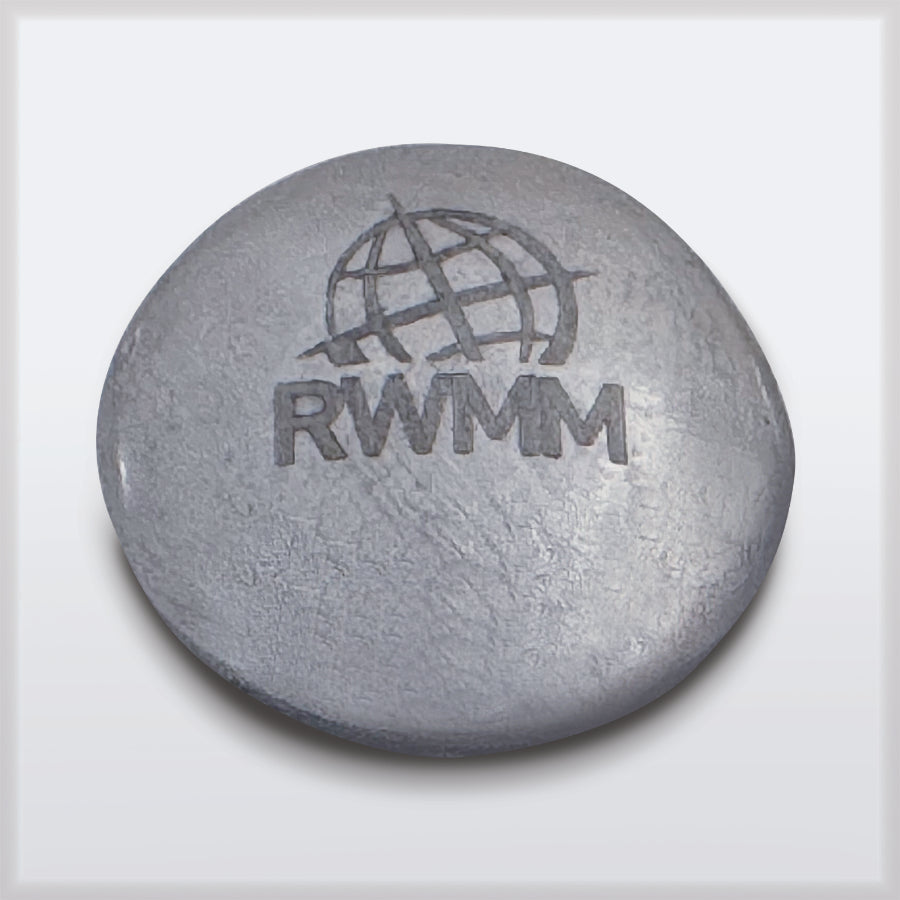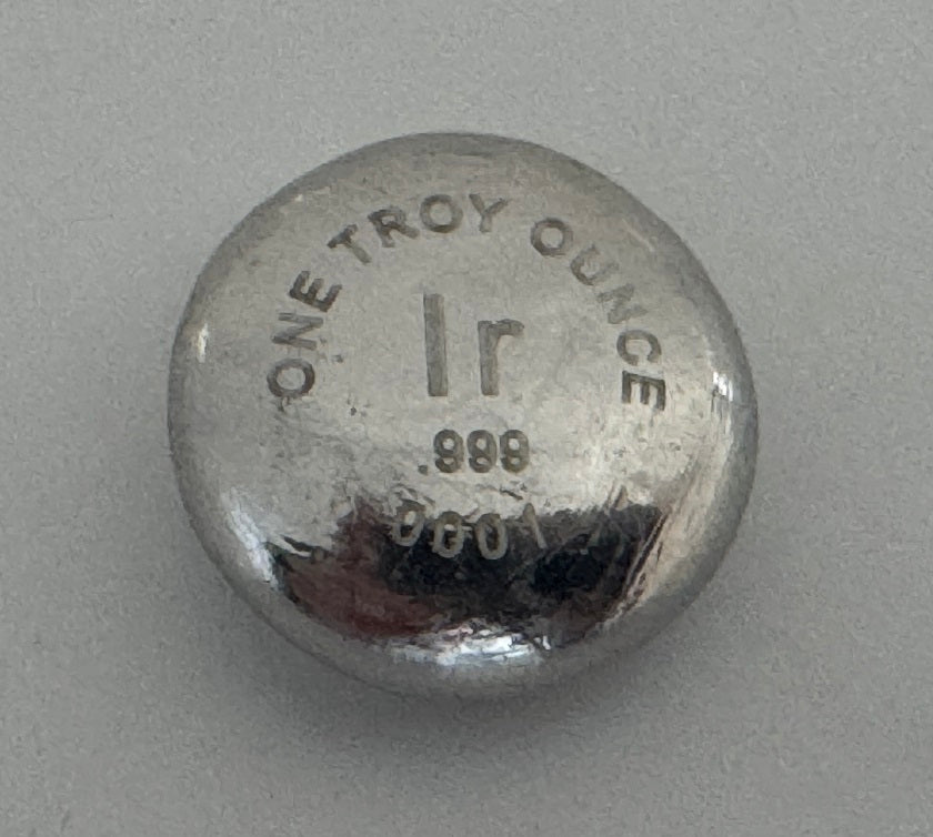 Inscribed on our iridium pellets are the chemical symbol (Ir), purity (99.9%), weight (one troy ounce), and a serial number (this number is unique and will vary). On the reverse is our logo. Unlike our standard Platinum Group Metal and other refractory metal ingots, these were fully melted in an arc furnace and they therefore approach iridium's theoretical density of 22.562 g/cm3. As always we had this batch tested by a 3rd party laboratory and they are at least 99.9% pure and their density is between 22.4 and 22.5 g/cm3. Therefore they are incredibly heavy for their size (about twice the weight of the same quantity of lead) and only a fully melted pellet of osmium in this size might weigh more (although the difference would be nearly imperceptible). Of course these iridium pellets don't have the characteristic blueish hue of osmium, so they are perfectly unique and could not be counterfeited using any other metal in the universe (i.e. substituting a tungsten, rhenium, platinum, or even a plutonium core). Nothing of this size and color could weigh this much!